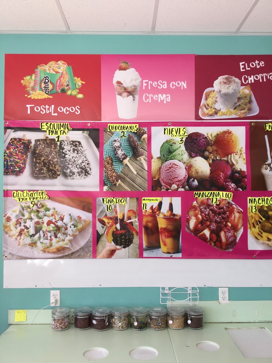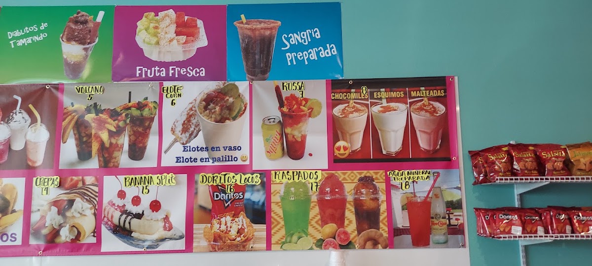 BARRILITO ,HIELO ,JUGO DE PINA ,CHAMOY TAJIN , FRUTA MIXTA , CACAHUATES, TARUGO ,GRENUDAS , GOMITAS DE TAMARINDO GUMMIES